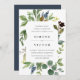 Elegantens botaniska bröllopsinbjudan ramar med uppgifter om bröllop firande med ett gräns av eucalyptus löv, blåa blommor och grönt bladverk. Inbjudningarna går tillbaka till massivt rökfritt marint blått.