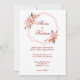 En tidlös inbjudan med ett geometriskt ring som omger namn. Ring är kantat av korall, rött och blommigt inslag. Det första namnen visas i ett elegant-rött skriptteckensnitt. Efternamn och andra detaljer visas i klassiskt, sofistikerat serif-teckensnitt. Baksidan har ditt namn och bröllop-datum som är inramat av en blommigt bouquet.