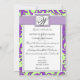 Bröllopsinbjudningar för Lila och kalk - matcha OSA kort och mer hittar du nedan på den här sidan. Varje inbjudan innehåller en blommigt löv-dämpare som skrivs ut i vibrerande lila över en bleks grönt. På framsidan och baksidan finns också en lavender som färgad-band med ett fyrkantigt monogram som du kan anpassa till rummets förnamn. Dessa bröllopsinbjudningar är inställda på ett baskort av hög kvalitet lagrar. Du kan dock ändra lagrar till linne, filt (präglat), återvunnet och flera metallskuggor om du vill ha under nummer 2 (välj stil, storlekare och papprare typ) under orangen Lägg till i kundvagn. En lista över merkostnaderna för ett fancierkort lagrar visas också under det alternativet. Varje inbjudan levereras med ett vitt kuvert från passande.