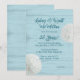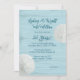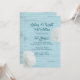Bröllopsinbjudan med strandtema med sanddollar och blå trädesign. Mörkblå-grön text är lätt att anpassa över en ljusblå trästrukturbakgrund. Två naturliga sanddollar pryder också papprets kanter. Välj att uppgradera med ett av de specialpapper som erbjuds.