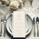 En elegant meny med en vintagekänsla, rekommenderas för ett bröllop med elfenben och guld som bröllopsfärger.