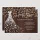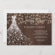 Vit glänsande diamanter bröllopsklänning på en mörkbrun lada träbakgrund med strängar av gnistrande ljus som gör en modern elegant rustik inspirerad bröllopsinbjudan.