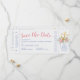 Elegant nautiskt ankartema spara datumet som ser ut som en boardingkortbiljett med boho bukett blommor runt en romantisk hjärtformad ankarbrölloppslogotyp i matt korallrosa och ljust dammig blå. Färger och typsnitt i mallen kan redigeras, eller helt enkelt ange dina resedetaljer och mottagningsinformation så att gästerna kan börja planera för att resa till er yachtklubb stranddestination bröllop.