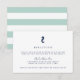 Designat för att samordna med vår nautiska mix bröllopsinbjudan samling, har detta kustnära bröllopsreception inklusionskort i mint och marinblått en liten sjöhästillustration högst upp med elegant marinblå bokstavsstil och en sjöskumgrön och vit horisontell randig baksida. Lägg till dina detaljer för mottagningen som tid, lokal och adress med hjälp av de tillgängliga fälten.