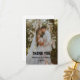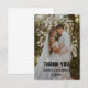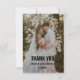 Bilden verkar vara ett tackkort för bröllop. Den visar ett romantiskt foto av ett nygift par mot en bakgrund av blommande blommor. Texten "TACK" visas tydligt, tillsammans med parets namn och bröllopsdatum.