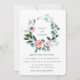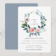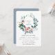 Vacker akvarellkrans av trädgårdslövverk och ömtåliga blommor, bröllopsinbjudan. Baksidan av kortet har en solid dammig blå färg.