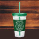 Tumbler för bröllopsläger med en design som innehåller en eldstad, berg och skogsträd i grönt och vitt. Anpassa den med den blivande brudens eller brudtjänarnas namn, lägerplatsens namn, datum eller annan information du vill inkludera