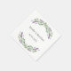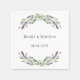 En stilren vit bakgrund dekorerad med violetta lavendelblommor och eucalyptusgrönska. Personifiera och lägg till era namn och bröllopsdatum.