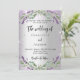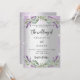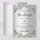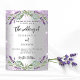 En modern, stilren bröllopsinbjudan. En falsk silverfärgad bakgrund med violett falskt glitter, gnistrar, lavendelblommor, blommor och eukalyptusgrönska. Anpassa och lägg till era namn och detaljerna.