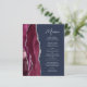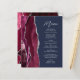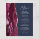 Den vänstra kanten på denna eleganta moderna bröllopsmeny har en burgunderfärgad akvatint agat-design med falskt silverglitter. Den anpassningsbara texten kombinerar silvergrå handskriven skrift och sans serif-teckensnitt på en marinblå bakgrund. Burgunder- och silveragat-designen upprepas på baksidan.