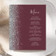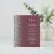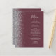 Den vänstra kanten på denna eleganta moderna bröllopsmeny har en falsk silverglitterkant. Den anpassningsbara texten kombinerar silvergrå handskriven skrift och kopparplåtstypsnitt på en mörk burgunderfärgad bakgrund. Baksidan har en matchande burgunder och silverdesign.