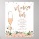 Mimosa bar skylt med en persikofärgad blommig arrangemang och falska roségulds blad. Skylten har också en falsk guld folie rubrik och ett högt champagneglas och falska roségulds prickar.
