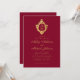 Denna eleganta burgunderröda och gyllene bröllopsinbjudan med vintagekaraktär har en vinatge präglad blomkrans i falskt guld med monogram. Brudens och brudgummens namn är skrivna med en elegant kalligrafisk skrift. All text kan anpassas och har en gyllene färg lik den falska guldprägling. Bakgrunden är burgunderröd.