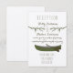 Ett rustikt bröllopsmottagningskort med en illustration av vintergröna grenar. Grön kanot längst ner.