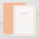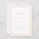 Enkel och elegant bröllops-RSVP-bilagor med minimalistisk design med en dubbel ramkant i trendig persikofärg på en krispig vit bakgrund. Anpassa med datumet för ditt bröllop. Utrymme finns för dina gäster att lägga till sina namn och svar för en svarsretur. Bokstäver och typsnitt är i matchande persikofärg . Baksidan av kortet är i matchande enfärgad persikofärg .