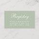 Ett enkelt bröllopsföljekort: bara vit text på grön färg, en mycket modern färg. Titeln Registrering är skriven med en elegant kalligrafisk stil.