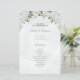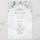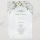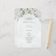 Detta bröllopsprogramkort har en mjuk, elegant stil med en pastellfärgspalet med grönt och vitt som dominerande färger.