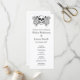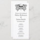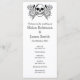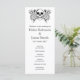 En bröllopsprogram som matchar Halloween-blommigtens tatueringsintervall. Den här monokroma designen har två band av ett illustrerat blommönster av ro, websar, spindlar och fladdermus och gott om utrymme för din serviceordning i mitten i en blandning av svart elegant typsnitt på vit bakgrund. Det skulle vara perfekt för en Halloween eller ett Gothic Temed bröllop eller som en del av ett Halloween fest.