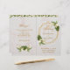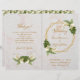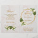 Ett mycket modernt, hopfällt bröllopsprogram som kombinerar många: geometrisk, marmor, metallisk (guld) och viss speciell typsnitt. Bakgrunden är vit marmor. Den har vita liljor och järnhaltiga dekorationer och en oregelbunden guld hexagon runt texten på framsidan, med calla lilies över den, upp lämnat och ned höger. Det finns också kalla lilies och fern garlands på övre gräns insidan och en liten kalla lilies dekor under texten på baksidan. Texten har en gyllene färg, som guld-hexagonen, och titlarna och namn i Bride och Groom är skrivna i ett kalligrafiskt elegant. Det har ceremonin i bröllop och bröllopsfesten på insidan och ett tack på baksidan. Vintage blombuquet med withe calla lilies and fern kommer från ett vintage postkort av Bertha Maguire (1862-1910), som nu är offentligt.