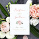Denna eleganta vigselritualdesign har en rosa påfågelsblomma med accent av rustika fågelfjädrar. Anpassa den stilfulla rosa skrivstilen och annan text med din önskade formulering. Den mjuka färgpaletten inkluderar nyanser av rosa, grönt, grått och guld. Perfekt för ett vår- eller sommarfirande.