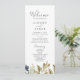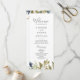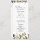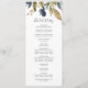 Det gröna bröllopsprogrammet i höst är perfekt för ett fallbröllop. Den moderna, geologiska designen har marinblått, sage grönt och guld löv med sprit av mörk blått blommor. Ta med namn i bruden och trimmen, datum och plats för bröllop, tack, serviceordning, brudens sida och ett minnesmärke "i kärleksfullt minne" som tillval.