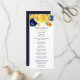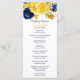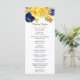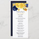 Här är ett vackert kort för bröllopsprogram som har en överkant gräns av vattenblommor och löv i marinblått och gult guld, med beröring av ljusblått och grönt. Din anpassningsbar är mörk blått och gult guld nedan, och det finns gott om utrymme för din text. Kortets baksida är solid passande mörk blått. Det här kortet matchar bröllopsinbjudningar och andra bröllop-produkter i vår butik, och användor teckningar från LABF-skapelser.