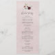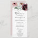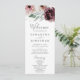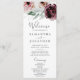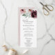 Bröllopsprogrammet romantik i blommigt är perfekt för ett elegant bröllop. Den moderna, roliga bohos-designen har romantiska vattenfärger i mjuka toner av burgundi, mauve, rosa och gräddvit med grönt löv. Ta med namn i bruden och trimmen, datum och plats för bröllop, tack, serviceordning, brudens sida och ett minnesmärke "i kärleksfullt minne" som tillval.