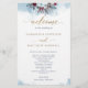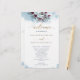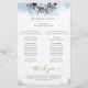 Elegant bröllop-programmet med delikat blå vattenfärgad bakgrund och den översta exquisite blommigt inslag med blommor och löv i dammig blå, marin, burgundi, lila, magenta och rött nyans. Guld i modern handskriven kalligrafi. Möjlighet att göra textändringar och justeringar genom att välja att anpassa ytterligare. Framåt med ceremonin i bröllop, tillbaka med bröllopsfest namn och tack för ert budskap till gästerna. Elegant och romantisk modern känsla.. En del av vår "kelestial Blooms"-samling med en mängd olika samordningsprodukter tillgängliga.