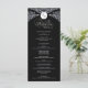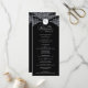Det här bröllopsprogrammet har en fetstilt svart bakgrund med ornerade vita fläckar som blomstrar, ge det som ett formellt och tidlöst stil. Överst visningar en dekorativ vapensköld initialer, medan centrum för designen presenter är parets namn och alla servicedetaljer för bröllop i en ren, organiserad utformning. Kontrasten mellan svart och vitt skapar ett slående utseende som betonar elegans och sofistikering, skapar det som ett val av perfekt för traditionellt eller kvällsorienterat bröllop.