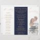 Det tresidiga bröllopsprogrammet har guld kalligrafibrev och en marin blå bakgrund med foto. Anpassa med din bröllop-information och hitta matchande utformningar från min "DreamHut"-butik.