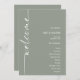 Bröllopsprogram för Grönt av roterad kalligrafi. Tillgänglig digitalt eller utskriven. En modern typografisk design med Välkommen i ett set skript och roterat.