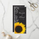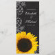 Ett bröllopsprogram för rustiska solrosor. Den har en ritbordsdesign, blomstrande snurrar och en gult solros. Perfekt för ett landsbyggsbröllop, solros bröllop, lada bröllop med mera!