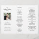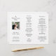 Trefaldig mall för bröllopsprogram med foto av paret. Vit papper med svart text viks som ett dragspel efter köpet. Skriv ut tre avsnitt och överför ett bild som visas längst fram. En enkel palett med neutralt matchar alla bröllop-teman.