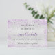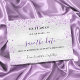 En modern falsk silverfärgad bakgrund dekorerad med lila falskt glitter, gnistrar och en klänning. Anpassa och lägg till ett datum och namn. Texten: Spara datum är skriven med en stor trendig handskriven stil.