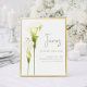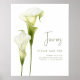 Denna bröllopstavla har en sofistikerad, minimalistisk stil. Ömtade kallaliljor i mjuka gröna nyanser avbildas mot en ljus bakgrund och skapar en atmosfär av sofistikering och stillhet. Designen är modern, luftig och perfekt för ett stilrent, romantiskt bröllop.