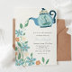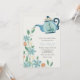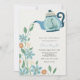Bröllopsinbjudan med en ram av blå, elfenbensvita och orange blommor med grönska som flödar från en söt, fantasifull tekanna. Anpassa med din information för den blivande bruden. Klicka på "klicka för att anpassa ytterligare" för att ändra typsnitt, storlek eller färg.