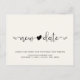Även om oförutsedda omständigheter kräver att du skjuter upp din bröllopsdag, låt dina gäster veta att din kärlek och bröllop kommer att fortsätta med detta enkla ljuskrämfärgade bröllopsförsenings- och datumändringskort. "nytt datum" är skrivet i modern typografi med ett hjärta som förenar de två orden. Under kan du anpassa dina namn och din nya datum- och lokalinformation om du önskar. På baksidan kan du anpassa din datumändringsinformation mer i detalj.