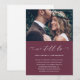 Elegant burgunder och vit ändra datum bröllopsuppskov anmälan. Detta enkla meddelande är ett chic sätt att låta inbjudna gäster veta att datumet för ert bröllop har ändrats på grund av oförutsedda omständigheter och innehåller det nya bröllopsdatumet. Denna trendiga anmälan har vacker "vi gift oss ändå" vit kalligrafiskrift på en burgunder marsala bakgrund med parets foto och en vit baksida på kortet.