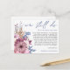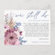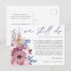 När omständigheterna tyvärr gör att du måste skjuta upp din bröllopsdag, så låter det här praktiska vykortet dig informera dina gäster. Vi Gifter Oss Ännu är skrivet med elegant skrivstil i dammigt blått högst upp och resten av texten på framsidan och baksidan kan du lätt anpassa. Moderna rosa och lila blommor och blå blad finns på vänster sida om texten till höger, och ett koordinerande blommotiv finns också på baksidan.