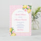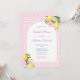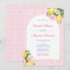 Denna moderna bröllpsinbjudan har en trendig valvform och citroner, med rosa blomsterdetaljer mot ett rosa och vitt tryck i bakgrunden som är gjort från en vintageplatta. Visas här för en bröllpsdusch men all text kan anpassas efter dina behov.