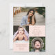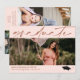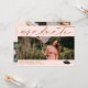 Elegant horisontell bröllroségul examen inbjudan med personligt foto på framsidan och tre ytterligare foton på baksidan. Dubbelsidig examen inbjudan med ljusrosa bakgrund. 2 i 1 examen meddelande och inbjudan med personliga foton och examenstudentens namn i mässing.