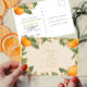 En ram av apelsiner med ett modernt elegant manus som tillkännager ert bröllop 'Spara datum'