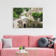 Kanvastrycket av bron över Bybrook River i den lilla, fyrtidiga byn Castle Combe med hus byggt ur honungssten färgad sten i Cotswets i England, Storbritannien.