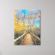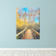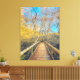 En träbro som leder vägen till en tät skog med barkat träd på sent höstkväll.