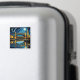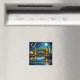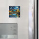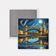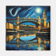 Den skapat utskriften av en vibrant surrealistisk nattscen visar en ljusbelyst bro med färgstarkt byggnad reflekterat på en flod, under en månbelyst, stjärnrik himmel.