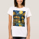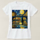 Den skapat utskriften av en vibrant surrealistisk nattscen visar en ljusbelyst bro med färgstarkt byggnad reflekterat på en flod, under en månbelyst, stjärnrik himmel.