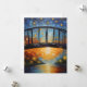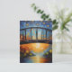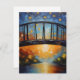 Ett vibrerande solnedgång kastar en varm glöd över en serenflod, korsad av en silhuetterad bro med träd som ligger vid båda stränderna. Himmel är prickat med färglösa, mosaikliknande plåster som skapar en livlig och dynamisk bakgrund.