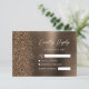 This elegant modern wedding RSVP card features a faux diamond glitter border on a bronze faux brushed metal background. The text is in modern handwriting script and sans serif font, with spaces for guests' names and responses. The reverse side features a matching bronze brushed metal and glitter design.