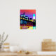 Poster i en digital målning av New York City-skylinen, med Brooklyn-bron vid nattfall, i levande skuggor av blå och djup fuchsisk rosa