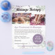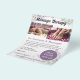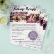 Reklam för dina massageterapeutiska tjänster med en flygblad som delar din affärsinformation och prislista. Designen inkluderar blomstermotiv i lila och salvia gröna blad. Framsidan har redigerbara bilder och låter dig dela en beskrivning av dina behandlingar, din affärsadress, telefonnummer, e-postadress och webbplats. En bubbla för speciella erbjudanden låter dig visa upp ett extraerbjudande för dina kunder. Baksidan låter dig lista dina behandlingar och prislista, oavsett om det är prenatal- eller djupmassage, kanske pedikyr, manikyr och ansiktsbehandlingar, anpassa efter eget hjärta.